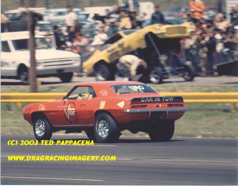 Bring 'Em Back Alive A new feature here at the Drag Racing Imagery website is the debut of "Bring Em Back Alive". This section will focus on the recovery and restoration of drag racing vehicles from the past. From time to time, I get requests from restorers whove just purchased an oldie but goodie and they are in need of reference photos to help them along in the restoration process. In my travels, I come across a lot of people who are in the process of restoring a car. When I find out about the cars they are restoring, I will add them to this part of the site. I will include their e-mail addresses and phone numbers so that if you can, you may be able to contact them with any pertinent information they might need to help them along with their restorations. If you know of a car that is under restoration and is in need of some help, pass it along to me and Ill post it here. Photos are welcome as well. Heres what I have so far.Vinnie Musicaro of Seaford, Long Island is in the process of restoring Jack Merkels 1933 gold Willys gasser. Finally this beauty will be back in action. However, Vinnie is in need of interior photos to help him along. He can be reached at 516.679.9146. Clint Richmond of Iowa has the super stock hugger orange Camaro of Vinny Tarantello. Vinny was the force behind Vitar Hydros of Long Island. Amazing how a Long Island N Y car can wind up in Iowa. Clints dilemma is whether to restore the car as the super stocker it was or as it came from the factory, an original COPO car. It has only 700 miles on it, all on the dragstrip. The restoration of the Camaro is almost complete as can be seen by the attached photos. Pic 1 Pic 2 Pic 3 Pic 4 Contact him at clint.richmond@mchsi.com Guy Boucher is in the process of restoring T V Tommy Ivo's 1970 Top Fuel Dragster. He has set up a website chock full of information and photos of the car when it raced and the in progress photos as well. It's a very cool and informative site. We look forward to seeing the resurrected digger in the near future. Here is the site www.guyboucherracing.com/ John Schreiner recently purchased this Anglia named Good Vibrations Attached is the early photo Good Vibrations (early photo) of my Anglia given to me by the seller. It looks like an early 70's photo. Jack Olcott thought it looked like National Speedway. I also attached a photo of the car in Good Vibrations form but with the scoop and headlights shown in the earlier picture. The wheels in the early photo are the same ones now on the car. The tilt nose hinge plates and locking pins and the style of the top chop further authenticate the early photo. Several people have commented that the top chop looks like a west coast job. The infomation I was given about the car being built by Sacks and Milanese was wrong. That car is now owned by Jack Oviatt, an East Coast Gasser member. Thanks -- John Schreiner Good Vibrations Anglia If you can help John, contact him at jnsvette@optonline.net . John Maze purchased this car ( Pic 1 Pic 2 ) through a friend in Steubenville, Ohio back in 1984. He never was able to find out much about it at all. He was told several stories through years but nothing definite. Nobody he talked to had ever seen one. It looked too professional to be the only one made. It now has a Kawasaki 1015cc engine in it. He has attached some pictures and can be contacted at jrmazer@alltel.net or 803-356-1822. Thanks for your help. -- John Maze Chris Loy of North Carolina owns the Sayanora Barracuda . He is going to restore the car but needs all the information and photos he can find to help his project. Chris has the help of his brother-in-law Bill Chatfield. If you have any information, contact Chris at chr_sloy@yahoo.com and Bill at 919-361-2514. Famed drag racing photographer Brian Beattie has acquired the former Jim and Alison Lee Great Expectations II Top Fuel Dragster. It has a 192 in Don Long chassis with a full Hanna body and a Toney Nancy interior. The photos attached taken at Englishtown Pic 1 Pic 2 Pic 3 show the car as it was in 1970 and as it is now. Brian is looking for any information or old photos to assist in the restoration. His intent is to restore the car to 1970 condition and show it a cacklefests. Brian can be contacted at: aafd11@comcast.net Keith Burgan aka The Roo Man from the land down under has 2 restoration projects going. First up is the 1970 Soapy Sales fueler that Steve Carbone drove in Austrailia. Tha car was originally the Mr. Lucky that was pictured on the cover of the January 1970 issue of Hot Rod with a 426 Pink Elephant and Kelly Brown's name on the cowl. It never ran in that form and actually made its first run in Australia with one of Huff's 392 bullets in the frame. He acquired the car from the Dustman brothers from northern Ohio and has slowly been collecting parts to restore it. Recently he purchased the former Trojan Horse 1971 Mustang body that Frank Jonkman ran a couple of years ago. Once the dragster is done, the flopper will be next. On his dragster wish list are a Powers & Reilly reverser and a M/T mag third member for an 8 3/4 Chrysler rear ( I know, the proverbial rocking horse crap). Later he will need a Buttera chassis for the Horse, an independant front end, and a quick change rear. If you can be of any help, contact Keith rooman@tds.com.